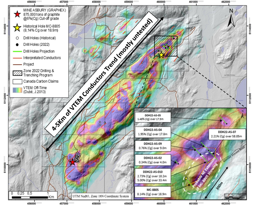 Toronto, Ontario, Canada, 30 nov. 2023 (GLOBE NEWSWIRE) -- Canada Carbon Inc. (la « Société » ou « Canada Carbon » ou (" CCB "), (TSX-V:CCB), (FF:U7N1) est heureuse d'annoncer qu'une importante minéralisation graphitique a été observée au cours de son programme de forage en cours sur la propriété Asbury (« la propriété »). La société souhaite profiter de cette occasion pour fournir une mise à jour générale concernant le programme d'exploration sur la propriété. Les travaux d'exploration en cours comprennent le forage, la réalisation d'un calcul de ressources conforme au Règlement 43-101, des essais métallurgiques et le développement d'une signature géochimique. Les informations fournies par les travaux d'exploration permettront à la société de procéder à une étude économique préliminaire qui devrait être achevée en 2024.